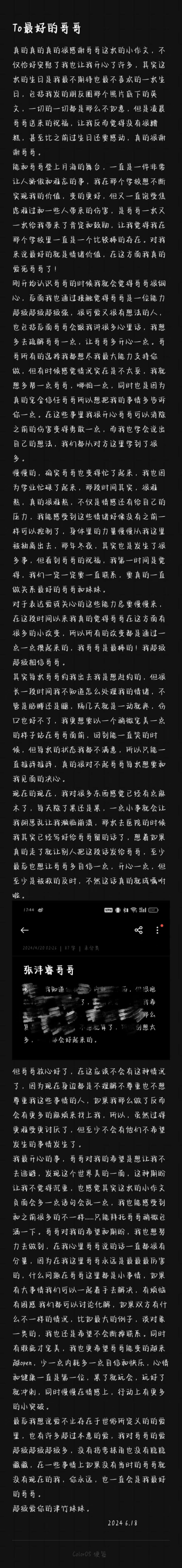 我最开心的事,哥哥对我的希望是想让我不去逃避,发现这个世界美的一面,这种期盼让我不觉得沉重,也感觉其实这次的小作文负面会多一点话会乱一点,我也能感受到和之前很多的不一样…… 只能拜托哥哥稍微包涵一下。哥哥对我的差谓和期盼,我也想努力去做到,在我心里哥哥说的话一直都很有分量,因为在我这里哥哥永远是最最最厉害的,什么问题在哥哥这里都是小事情,如果有大事情我们可以一起着手去解决,有烦恼有困惑我们都可以讨论化解,如果双方有什么不一样的情况,比如最大的例子,谈对象一类的,我也还是希望不会断掉联系。同时有瑕疵才完美,我也更希望哥哥能变的越来越 open,少一点内耗多一点自信和快乐,心情和健康一直是第一位,累了就玩会,玩好了就冲刺,同时慢慢在情感上,行动上有更多的小突破。