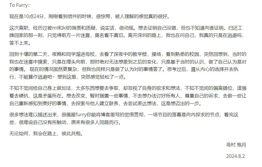 现在,经过这段刻骨铭心的经历我觉得岛村学长也会慢慢明白过来,就算这个选择做错了也没关系,就像那天我说的,后悔所有做错的决定都是对不起当时的自己(虽然我不是100%认同这句话不过我觉得对岛村学长很合适)我一直觉得岛村学长已经很好很努力啦,岛村学长能被我的话所打动的话我可以说很开心,我也希望岛村学长能够放开一些,去认识下接触下更多的人,也许生活就会有很多新发现~